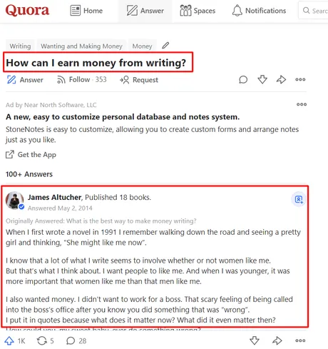 As you can see in the screenshot, someone asked a question - How can I earn money from writing? And the top answer was by a user named James. And till now his answer was viewed by 106k people!