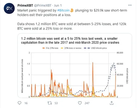 We also have the reality what happened here in the market. When we have panic events like Elon musk's tweet, China fudding, regular people realized losses. This is a chart from PrimeXBT, they are saying 1.2 million BTC were sold at between 5-25% losses in the exchanges.