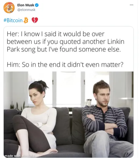 What was his Tweet? Bitcoin with broken heart symbol! And of course, read the meme attached with it.