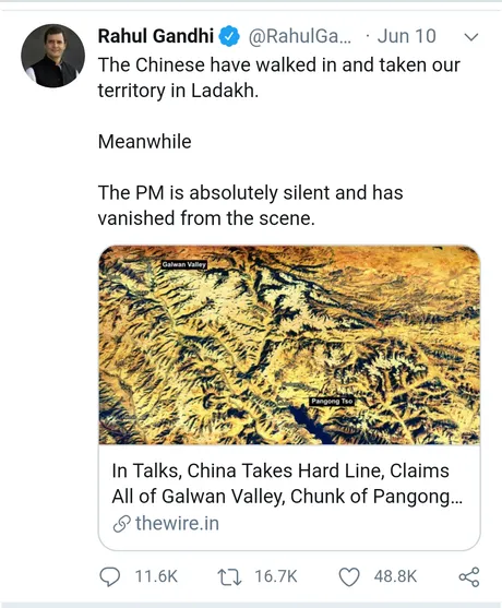 Congress leader Rahul Gandhi tweeted that even though the Chinese had entered Ladakh and occupied Indian territory, Prime Minister Modi was not talking about it.