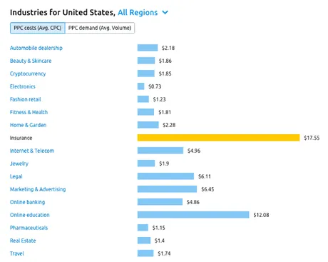 That means if your niche is insurance and you can rank your website in Google search, you are probably going to be a rich person soon. On the other hand, the electronic niche will give you $0.73 PPC, which is very low if we compare it with insurance. There are some different niches where you may get lower than $0.20 PPC.