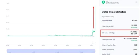 Dogecoin's all-time low was $0.00008547, and it gained 412765.95% since then. Just imagine that. It looks like Elon Musk's tweet helped Doge go to the moon within two days!