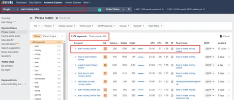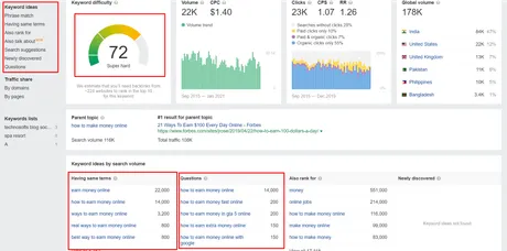If you go to the overview, you'll see that ranking is very hard with this keyword. Also, at the bottom, Ahref will suggest some long-tail keyword which you may choose. It will suggest question-like keywords also which people use to search with that specific keyword. For example - How to earn money online? Or How to make extra money online?