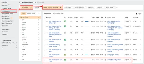 Now look, we narrowed down the search to only eight keywords. Some of those may be useless for our article. We are targetting global traffic, and as per our requirement, the last keyword phrase, "Earn money online $10 a day," looks fine. KD is only ten, and global traffic is monthly 900. Not bad for a newbie to start with.