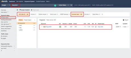 Now search on keyword explorer with the keyword "dog jacket". From the search filter, select KD up to 20 and include the word "Best". Now see only one keyword phrase: KD is only 17, and monthly traffic is 200.