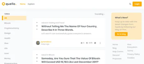 Quello is a decentralized question and answer platform based on Hive where you can earn money (or cryptocurrency) just by posting questions and answers. Or you can just say, Quello, is a question-answer platform(Dapp) developed for Hive blockchain, that pays you with Hive tokens for answering people's questions.