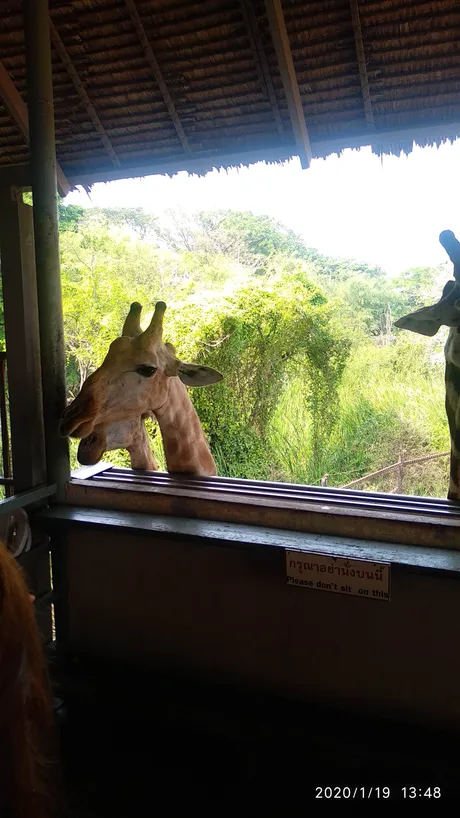 ব্যাংকক সাফারি ওয়ার্ল্ড। জিরাফ ভাইজান খাবারের লোভে উঁকি দিতে এলেন।